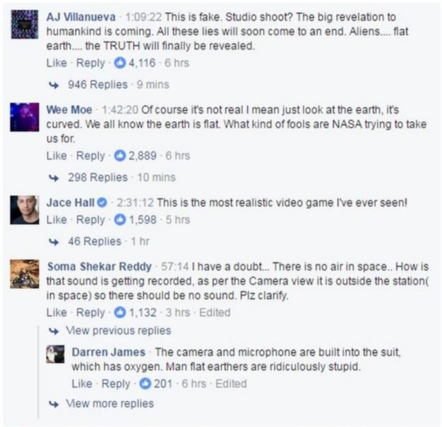 Huge numbers have watched and commented on the feeds. Some 17m people viewed the „live“ on Unilad’s Facebook page and another 26m people watched four hours of footage on Viral USA’s page. They appear to be old material from between one and three years ago. The eagle-eyed may have noticed that there was no mention of any such Facebook live on the social media accounts of Nasa or the ISS, which would seem unusual.